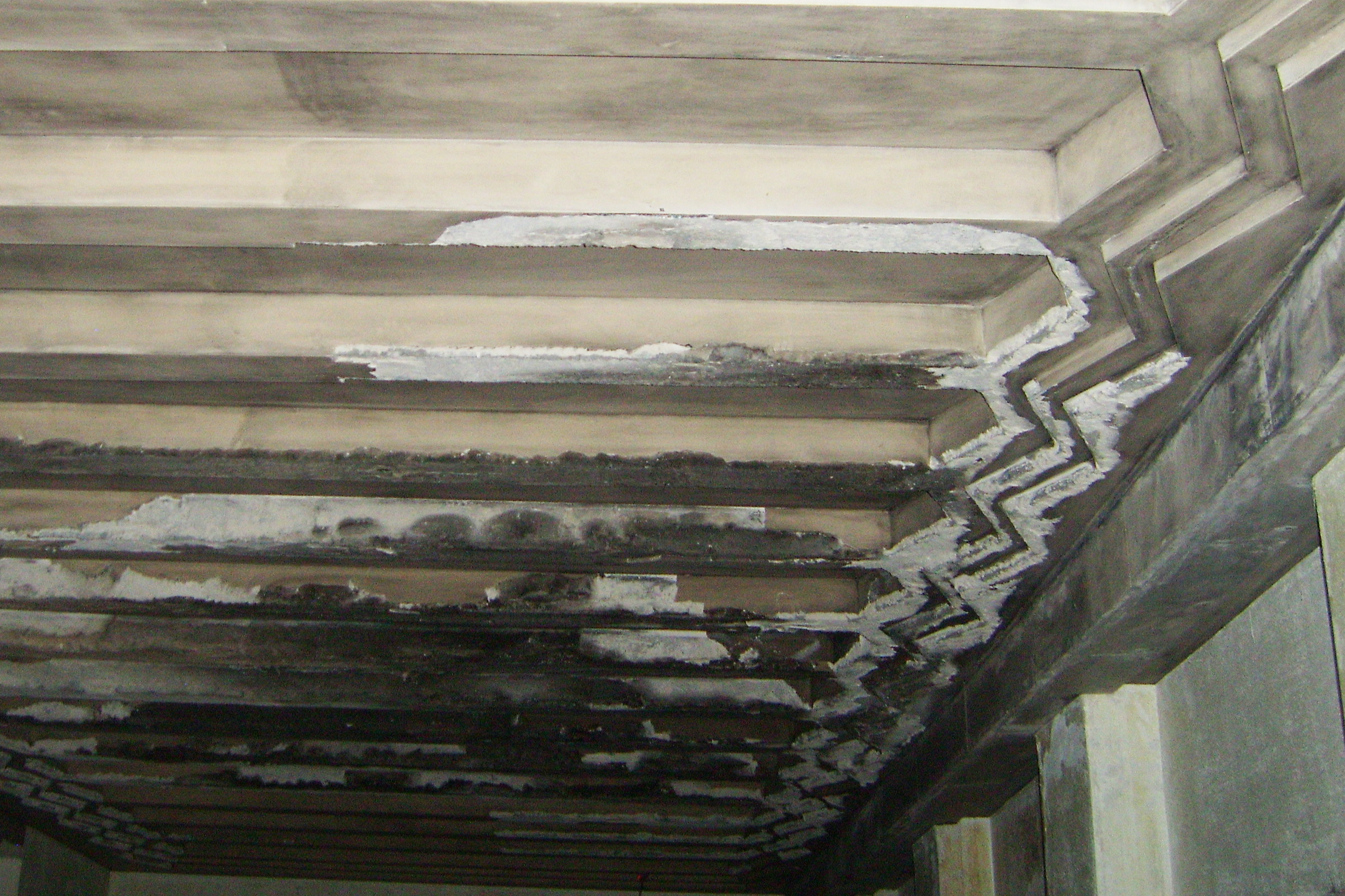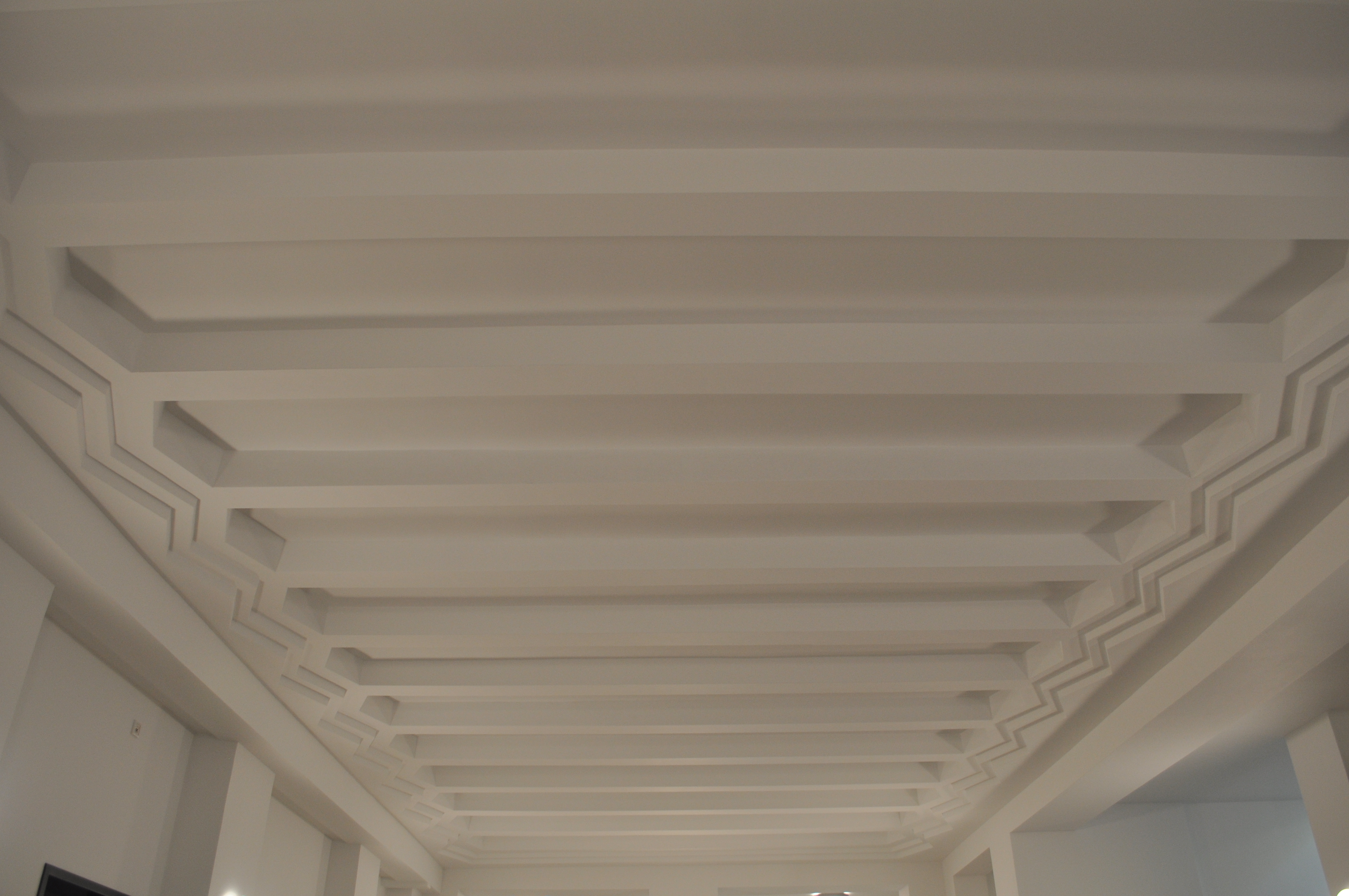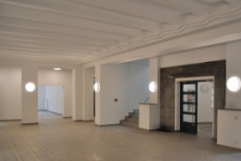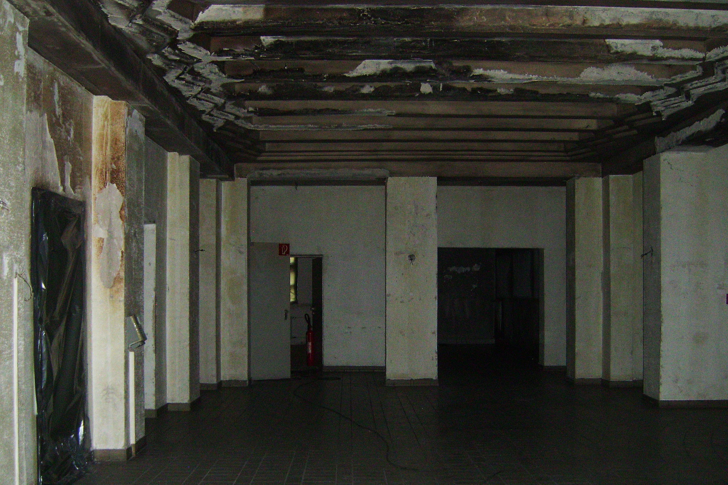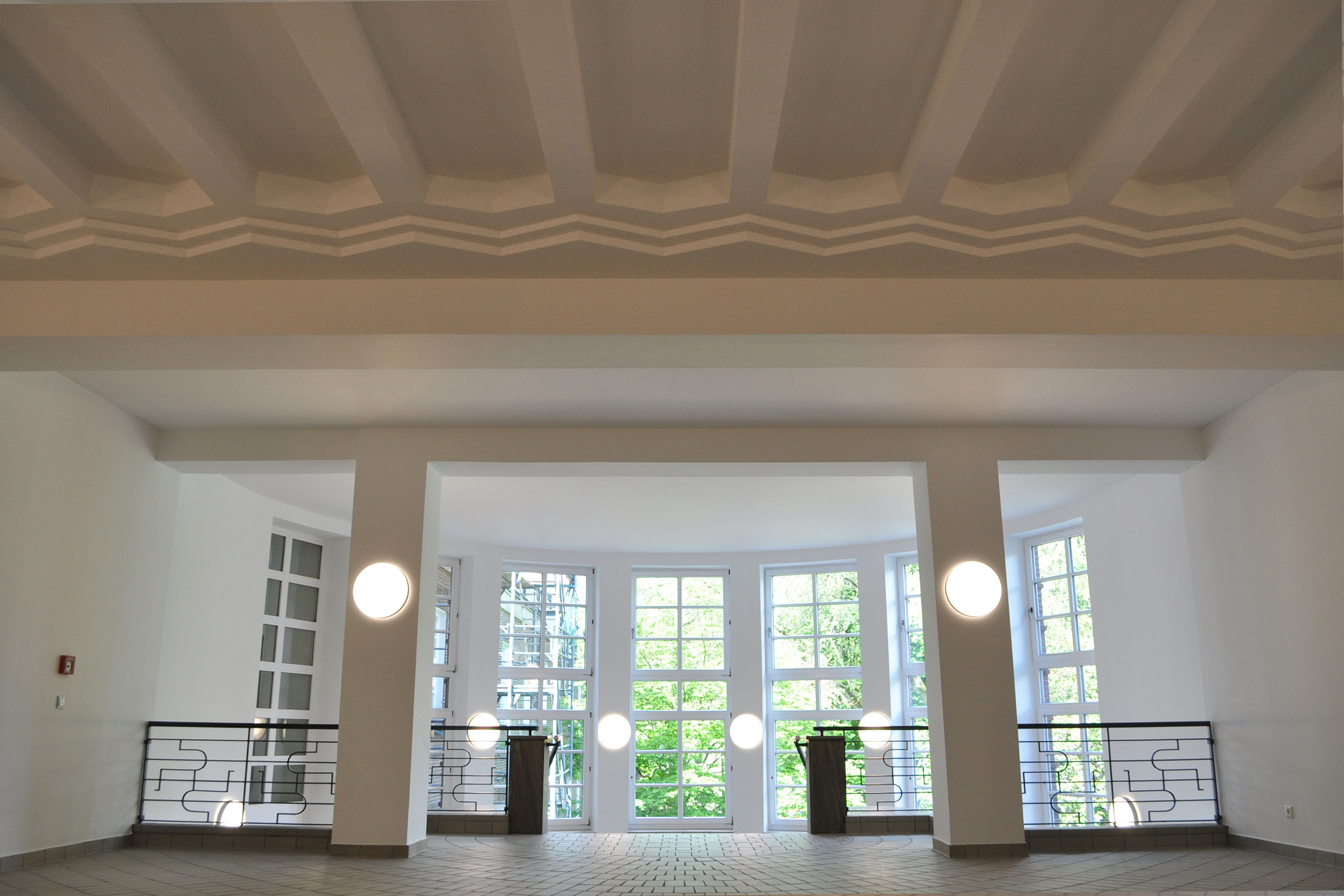 Im stark vom Brand betroffenem offenem Treppenhaus und Hallenbereich im 1.OG und 2.OG sind an den Wänden und an der kassettiert gestalteten Decken Innenputzarbeiten, mit anschließenden Maler- sowie Lackierarbeiten an den Fenstern, Heizkörpern und Türen erforderlich gewesen. In der Teeküche (Brandherd) musste eine Kernsanierung durchgeführt werden. Der bereits entkernte Raum wurde wieder in seiner Funktion als Teeküche hergerichtet und zusätzlich mit einer Abluftanlage ausgestattet.